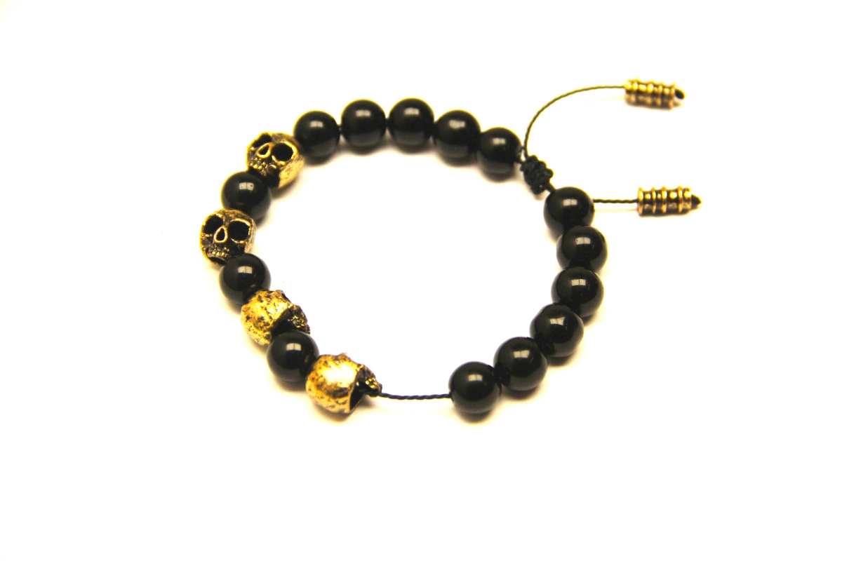 Rankų darbo apyrankė iš karoliukų su kaukolėm.